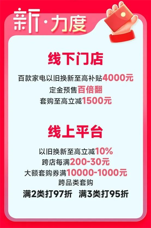 活动期间,苏宁易购双线优惠力度加码。消费者到线下门店购物可享百款家电以旧换新至高补贴4000元、定金预售百倍翻、套购至高立减1500元、银行支付立减等多重优惠。线上平台也推出以旧换新至高立减10%、跨店每满200减30元、满万减千大额套购券、家电家装跨品类满2类打97折、满3类打95折等丰富玩法。