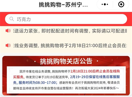 2月,Costco开市客官方指定的线上商城挑挑购物微信小程序公告,因Costco开市客在线业务调整,挑挑购物将于2月18日21:00后终止会员在线购买服务,待发货订单于2月19日配送完毕, 2月19~29日保留在线售后客服服务,服务时间为08:30~17:00。公告中提到,敬请会员期待业且持续支持Costco开市客自营在线运营服务。