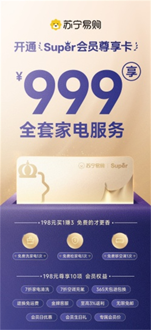 苏宁易购表示,随着人们健康意识的提升和消费习惯养成,家电清洗、检测等在内的家消费需求持续走热。苏宁易购推出Super会员尊享卡,旨在将服务权益延伸至家电清洗、检测、空调移机、充氟等家庭生活场景,打造更全面、更专业、更贴心的会员生态体系。