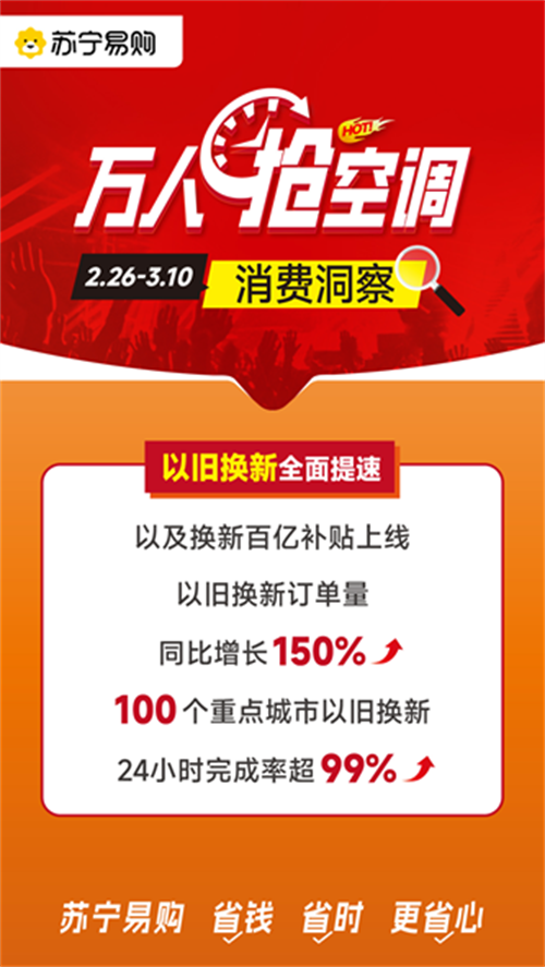 根据苏宁易购数据,“万人抢空调”活动期间,以旧换新订单量同比增长达到150%,在服务举措方面,苏宁易购通过加大空调备货、加码免费安装、一站式换新等组合手段升级用户体验,全力保障空调到货后24小时安装上墙,100个重点城市以旧换新24小时完成率超99%。