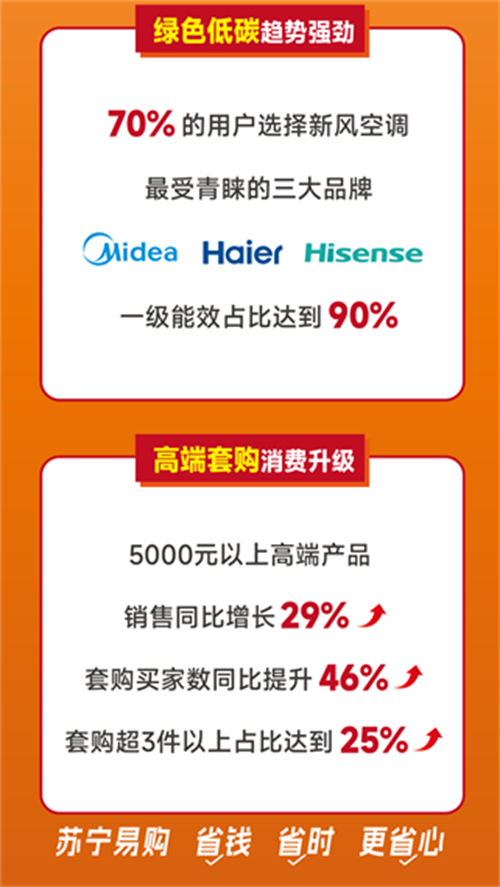 此外,消费者对于高端套购的需求不断升级。“万人抢空调”活动期间,苏宁易购为消费者提供以旧换新、预存立减、套购满减等多项优惠,叠加优惠可达20%。其中以旧换新补贴10%,套购满减最高可达1500元。在这些优惠政策的带动下,今年的高温旺季空调需求得到提前释放。苏宁易购数据显示,5000元以上高端产品销售同比增长29%,套购买家数同比提升46%,套购超3件以上占比达到25%。