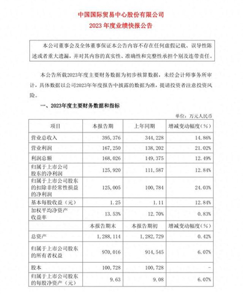 近日,中国国际贸易中心股份有限公司(简称“中国国贸”)发布了2023年度业绩快报,去年公司营业收入超过39亿元,实现两位数增长,主要是酒店及商城收入增加较多所致。