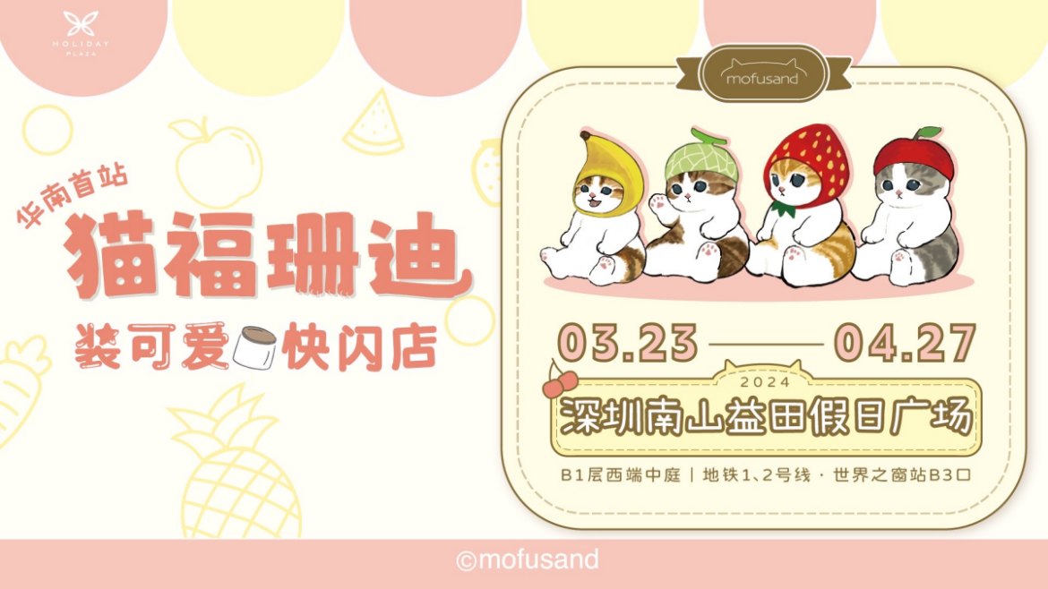 作为深圳标杆的商业项目,南山益田假日广场一直在求新求变的道路上探索,致力于打造有温度、有生命力的多元文化购物空间。在刚刚结束的2023年里,益田假日广场就先后与HEYONE、TNT SPACE、RORO JUMP等多个顶流IP开展了跨界合作,也期待在2024年,能够以猫福珊迪为起点,为深圳消费者带来更前沿的消费体验!