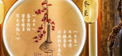 “八节则对应着屏风中“【秋分】月圆时分,宜饮酱香,共迎黄金岁月”等八节韵律,以及夏荷、枫叶、冬梅等四时置景上悬挂着的灯笼所描绘的时令美景。