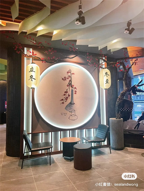从图透来看,“四时”对应着店内装潢头顶处的纹理纸流云造型,以及春暖花开、荷香扑鼻、秋果成熟、冬梅绽放的氛围感。