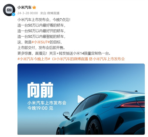 小米汽车官方微博在今日零点宣布“小米汽车上市发布会,今晚7点见”;与此同时,公开了小米汽车发布会主题——“向前”。官方表示,小米汽车的目标就是造一台50万以内最好看的轿车,造一台50万以内最好开的轿车,造一台50万以内最智能的轿车。