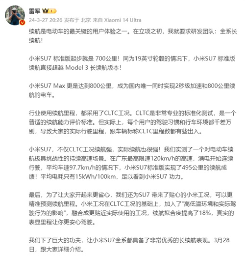在3月27日晚间,雷军还公布了小米汽车的续航能力。他表示,小米SU7标准版起步就是700公里!同为19英寸轮毂的情况下,小米SU7标准版续航直接超越Model3长续航版本。小米SU7Max更是达到800公里,成为国内唯一同时实现2秒级加速和800公里续航的电车。