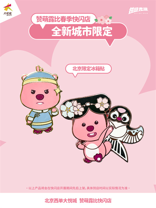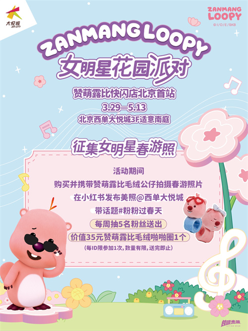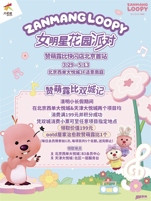 3.29-4.26期间,参与快闪店内打卡活动,在小红书晒出和ZANMANG LOOPY的合影,还有机会获得限定礼品。此外,在即将到来的清明小长假,北京西单大悦城与天津大悦城联合发起「赞萌露比双城记」活动,双城均消费满199元即可获赠人气周边。借力假期短途游带来的潜在客流量,活动紧密串联京津双城实现流量驱动,开启城市春日限定的美好记忆。