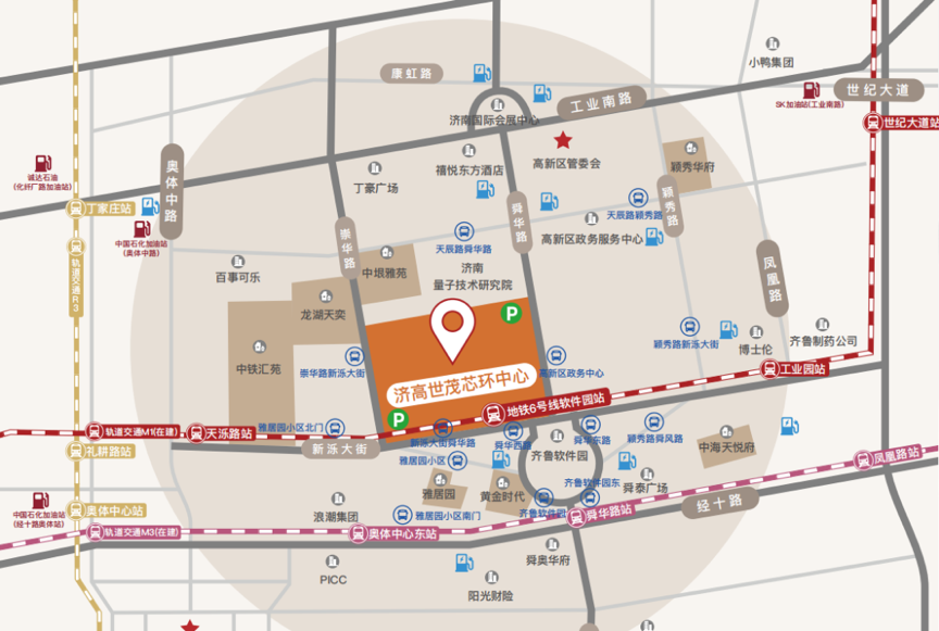 济高·世茂芯环广场地处山东省高新区综合评价首位的济南高新技术核心区,邻接高新区管委会、高新区政务服务中心。3公里范围内辐射150+座写字楼、1000+家高新技术企业、140+个优质社区、10+家四星级酒店、100+个教育配套以及超26万的常住人口。
