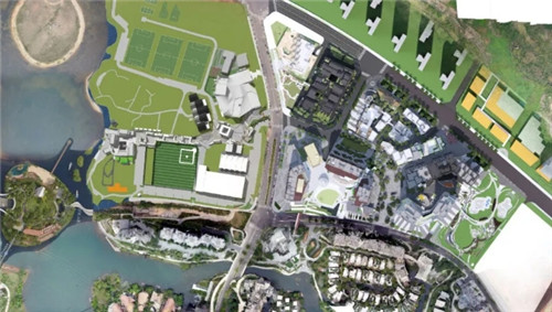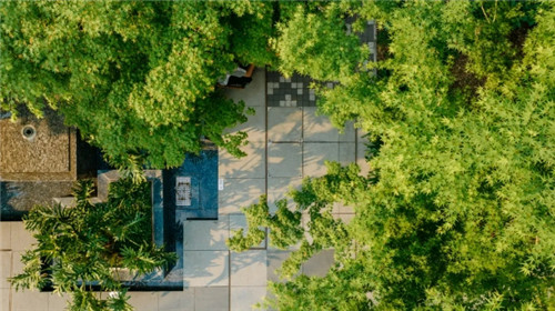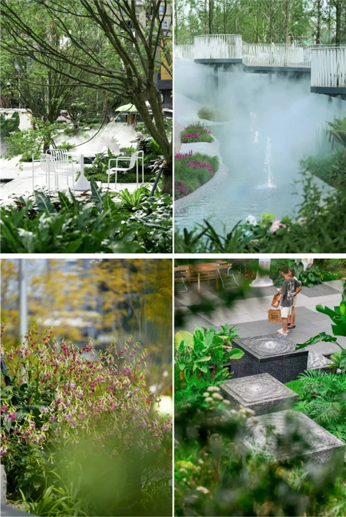 多元化的商业街区被划分为A、B馆,在高低错落的地形下,本为钢筋混凝土的商业建筑群实则被分割成一个个不规则体块,打破了过往传统的街块尺度,又与每一方绿地景观以相互围合的形态穿插融合,绿植环绕其间未显冰冷距离之意,赋予细腻富有生机的温度感。