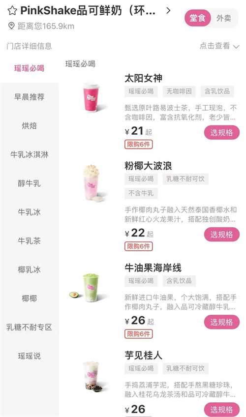 根据品牌点单小程序显示,PinkShake品可鲜奶产品包括醇牛乳、牛乳冰、牛乳茶、椰乳冰、椰椰等饮品系列,烘焙、牛乳冰淇淋等品类,不仅如此,还特开发了乳糖不耐系列的3款饮品。