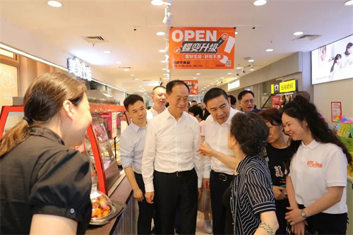 ▲重庆百货董事长张文中一行到门店查看经营情况,和顾客近距离交谈,给一线员工加油鼓劲。