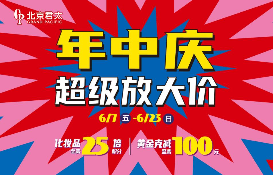 年中庆超级放大价:6月7日至6月23日,化妆品至高可享25倍积分,黄金克减至高100元。