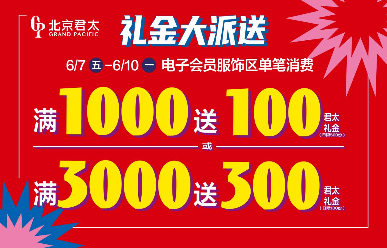 电子会员专属优惠:6月7日至6月10日期间,电子会员在服饰区单笔消费满1000元赠送100元君太礼金,满3000元赠送300元君太礼金。