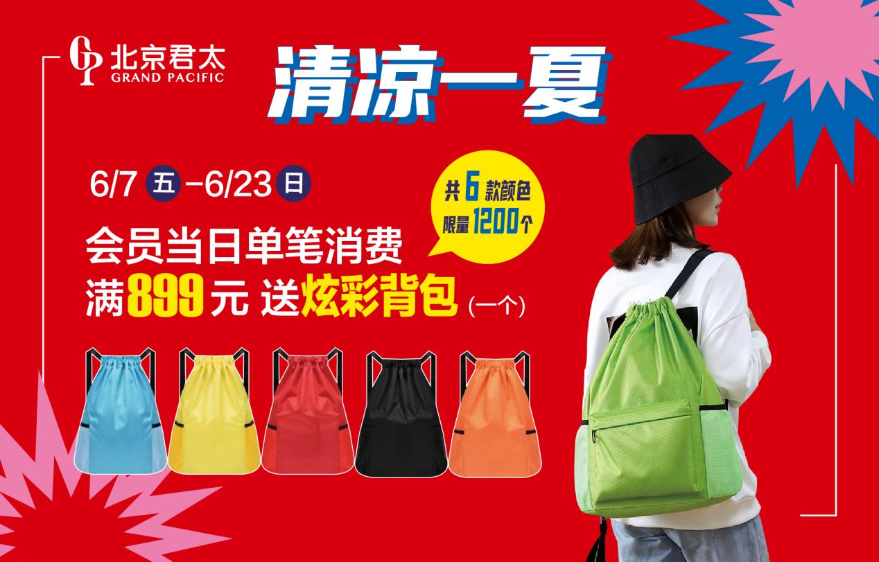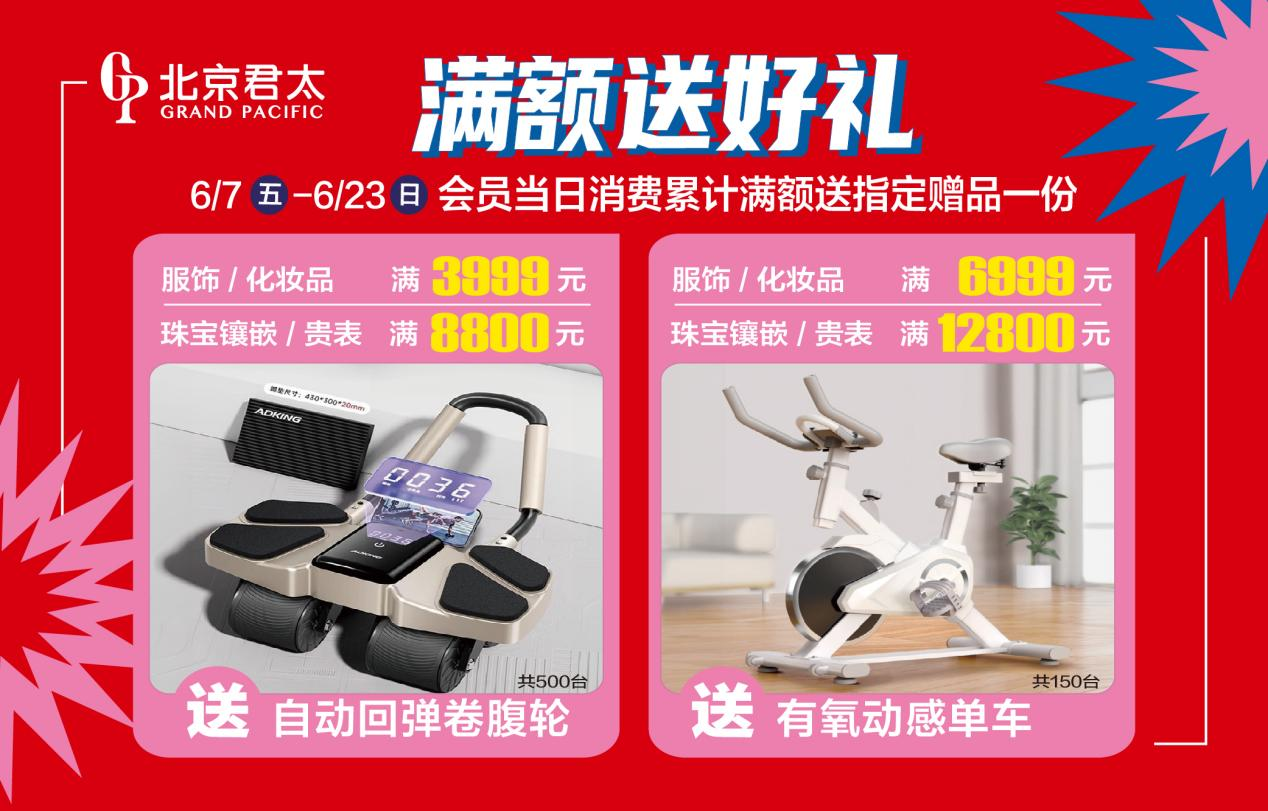 在节日期间,我们将举办满额赠好礼活动:6/7-6/23会员当日消费,累计满额送炫彩背包、自动回弹卷腹轮、有氧动感单车等超值好礼!会员登录招商银行掌上生活APP进入北京君太,即享400团500君太专属美妆券!还有分享送好礼活动以及各大银行的特别礼遇。
