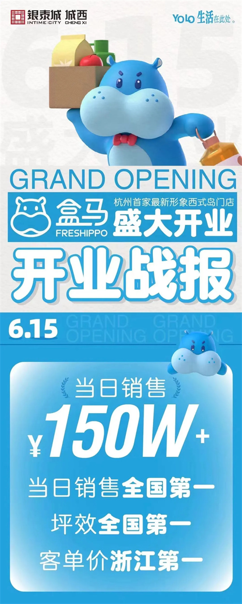 开业首日,盒马杭州首家最新形象西式岛门店当日销售以150W+战绩登顶全国第一,同时达成了坪效全国第一、客单价浙江第一的优异表现。