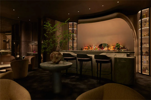 除了主餐区,店内还设有酒吧区,从白色空间转为暗色,提供了一个极具反差感的空间,以新鲜调酒为特色。