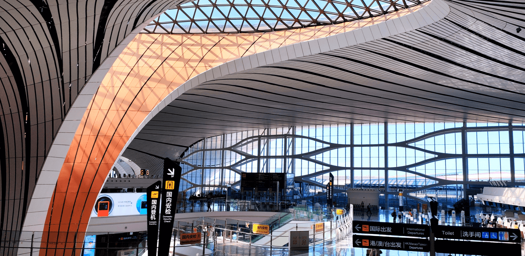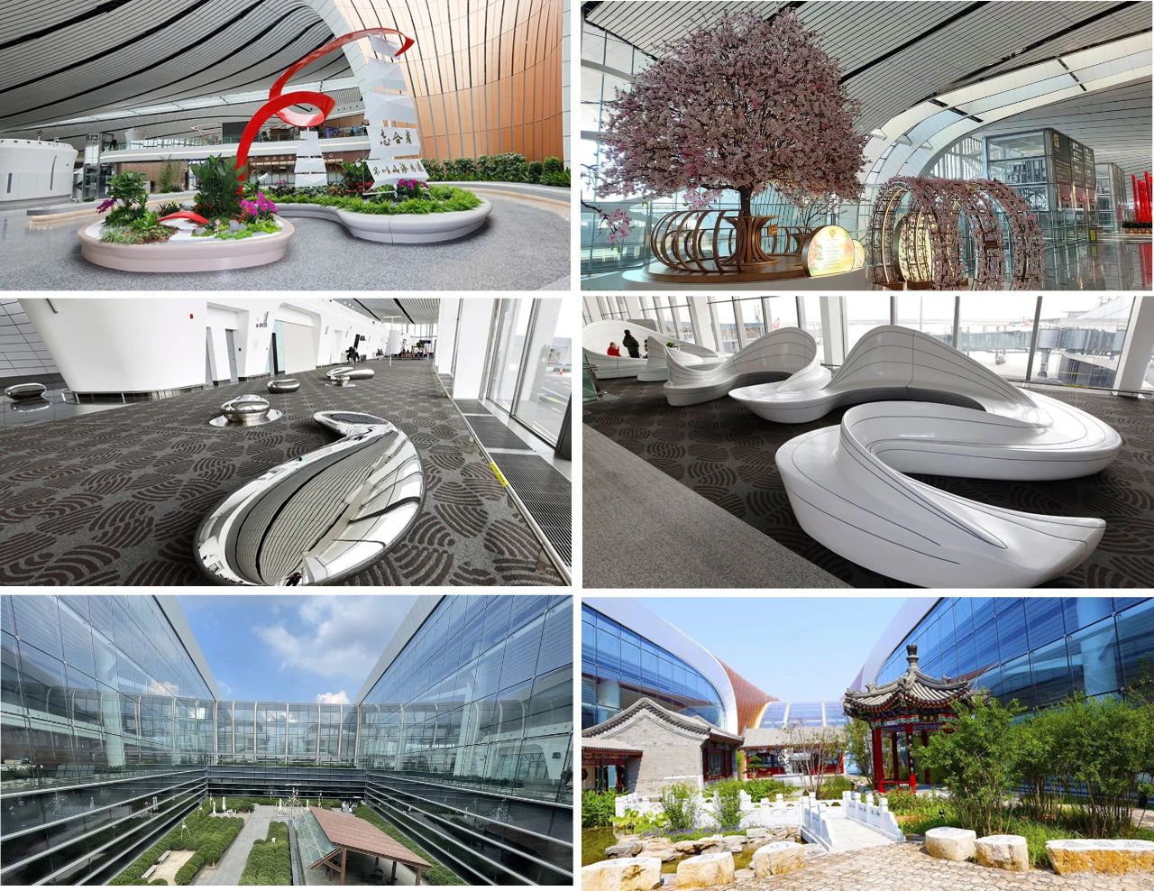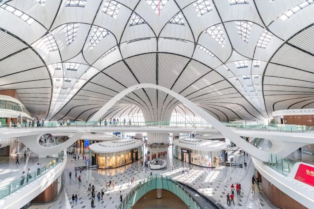 作为国内外旅客进京的第一服务窗口,大兴机场以“凤凰展翅”形态,映射出中国古代文化的悠久与神秘,同时也极大地方便了旅客的出行,合理提升了机场的运行效率。隐藏在“五指廊”端头的主题园林,再一次将中国传统文化进行意象设计。亭山、游廊、藻井、花窗,当中式建筑之美融进现代化机场,加之通过采用大量玻璃材质引入的自然光线,随性营造出通透与灵动的空间氛围。