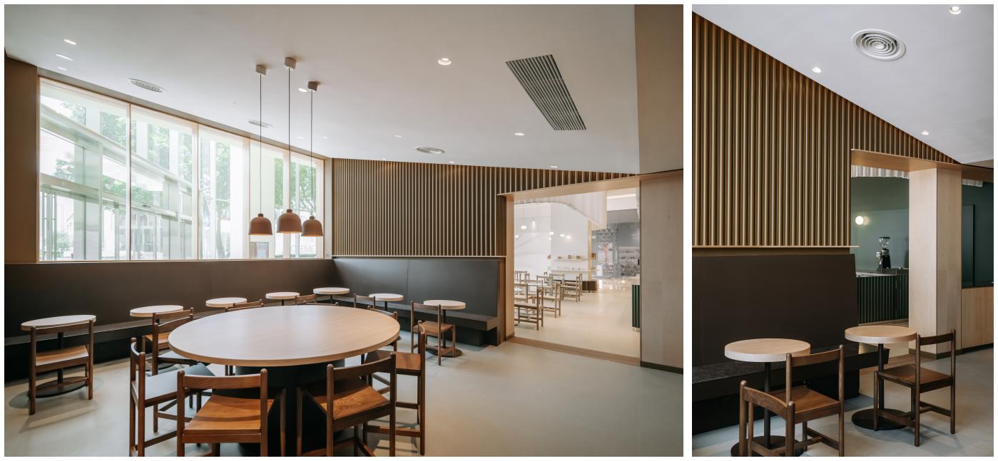 蕴意着相聚的圆桌与定制座椅,也契合了“湖区”与“山区”的不同气质——在“湖区”,大小高低不同的透明圆桌犹如莲叶漂浮;而在“山区”,长条座椅从四周沿着墙面延伸而出,像是山脚下的石凳,深棕色木椅和实木圆桌则带来山峦般的稳重与安定。在座椅的设计上,蓝瓶咖啡与Sun at Six合作,以传统中式家具为原型、结合当代简约线条,为这个现代空间注入古典韵味。