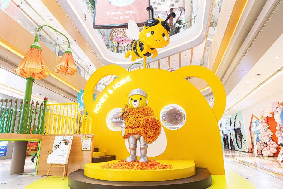 消费者在成长,购物中心也要同步精进自我。位于青岛的凯德MALL∙新都心,将更多注意力倾斜给年轻家庭。继2016年开业时推出原创IP“蜜罐熊”后,2023年它的朋友“小蜜蜂Homie”高调上线,从户外广场、公共区域,到品牌门店,这一对充满想象力和活力的好友形象在凯德MALL∙新都心随处可见。除了视觉共鸣,凯德MALL∙新都心还为两大IP形象推出专属主题空间:位于5层的源蜜空间围绕蜜罐熊的故事展开,以及位于3层的童蜜空间则是蜜蜂 Homie的活力之家,合力为亲子消费注入更多动能。通过IP故事、租户品牌、空间场景的融合与串联,顾客在消费过程中,自然获得类似主题乐园的游乐体验。随着主题空间打造、增量客流涌入,多个新进品牌SEPHORA、Hazzys 、UGG、ECCO、UNIQLO,以及超过60次异业合作,2024年零售品牌以销售额提升40%的表现领跑全场,全场销售额相比2019年提升超过30%,比客流复苏更快,以绝对实力成为青岛排名前三的购物中心。