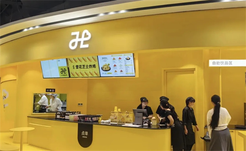 「小嗨爱炸」新店占地面积70平方米左右,门店装修设计选用明亮的黄色为主色调,设有用点餐区、自助饮品区、用餐区等。