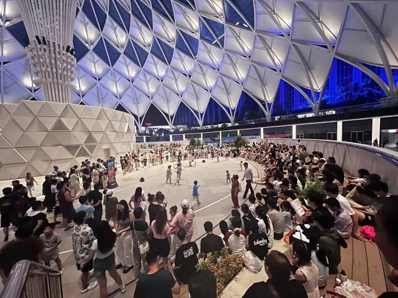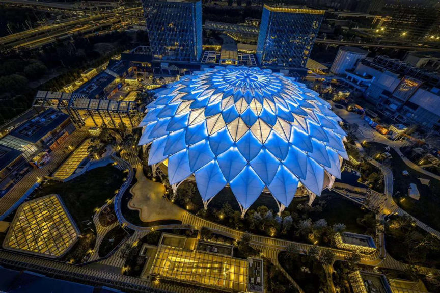 穹顶天幕由帆布及膜结构组成,仿若一瓣瓣荷花叶片,从天空中缓缓倾泻而下,每片叶片下都有6至8组LED灯光,配合底部的LED屏幕可在夜晚上演36种色彩变换的绚烂灯光秀。穹顶之下的“超极现场”常年举办各项国际极限赛事、音乐节、电竞赛、艺术展等潮流文化活动,现已成为全市音乐与运动发烧友的社交舞台。