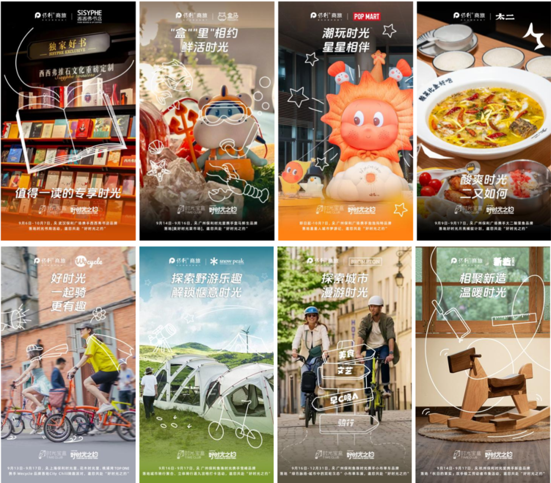 例如9月9日-9月17日,广州保利广场携手太二酸菜鱼品牌落地好时光月亮捕捉计划;9月16日-12月31日,广州保利鱼珠时光携手小布单车品牌落地“绿色脉络-城市中的双轮生态”小布单车展;9月14日-9月17日,杭州保利时光携手木墨新造社区落地「秋日的果实」双手做工劳动者市集活动,匠造秋日之约。