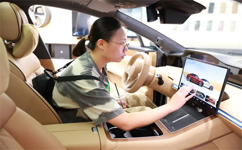 进入馆内,映入眼帘的是科技与美学融合的享界S9、问界M9等系列展车,炫酷的外观设计,像极了科幻动作片里的明星道具。坐进体验后,才更怀疑自己穿越到了未来时空。车机联动,智慧出行,手机、手表就是“车钥匙”,不仅能一键开车门,还能一键开空调,调节车内温度。