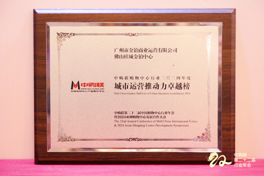 佛山桂城金铂中心荣登中购联购物中心行业2024年度城市运营推动力卓越榜
