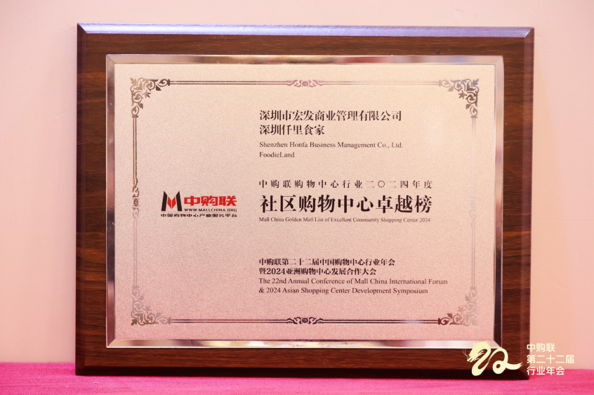 此次大会,发布的“Golden Mall中购联购物中心行业2024年度专业竞争力榜单”中,深圳仟里食家荣登中购联购物中心行业2024年度社区购物中心卓越榜。未来,中购联及全体商业同仁携手共进,共同应对中国商业地产行业所面临的危机与机遇,以不变的初心砥砺前行,推动行业持续变革,行稳致远!