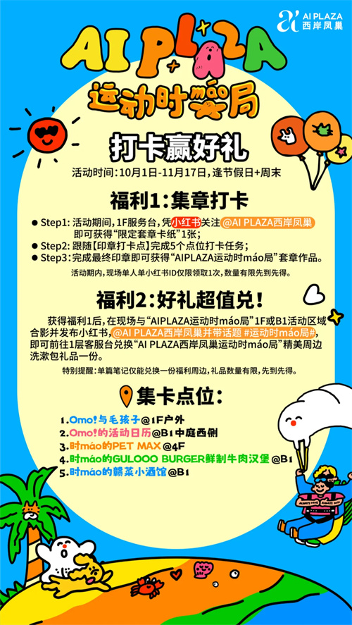 OMO! 听说沪上的松弛感达人&时髦精们这个秋天都会来AI PLAZA?因为!2024年9月25日起,AI PLAZA 运动时máo局空降而来!本次活动联合插画艺术家OMO33打造AI PLAZA首届运动嘉年华,包含萌宠、亲子、运动等主题活动将火热上演,一起在百变生活观察员「OO!」的陪伴下打卡魔都宠物友好天花板,邀请各位伙伴们共筑人宠友好新风尚,一起运动充能,快乐上头。