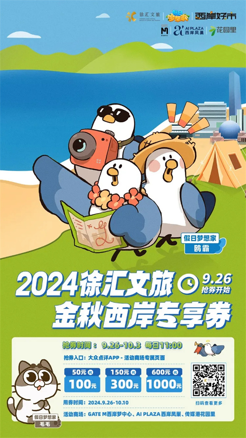 另外,9月下旬,AI PLAZA即将送上巨额好礼,50团100、150团300、600团1000,百万金秋西岸专享券即将派发!可前往AI PLAZA西岸凤巢指定商户进行消费。持续关注AI PLAZA大众点评官方账号,随时掌握优惠券领取时间以及参与商户信息。邀请大家共赴一场文旅盛宴。