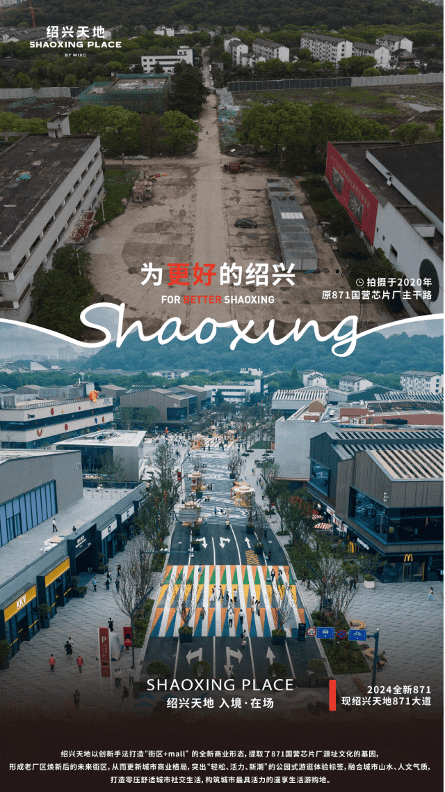 绍兴历史悠久,名人辈出,景色秀丽,物产丰富,素称“文物之邦、鱼米之乡”,是我国历史文化名城之一。目前它正以现代化经济新城的样貌向世人展现其独特的魅力。绍兴天地以创新手法打造“街区+mall” 的全新商业形态,延续万象商业的成功经验和高阶品质的同时,提取了871国营芯片厂源址文化的基因,形成老厂区焕新后的未来街区,从而更新城市商业格局。