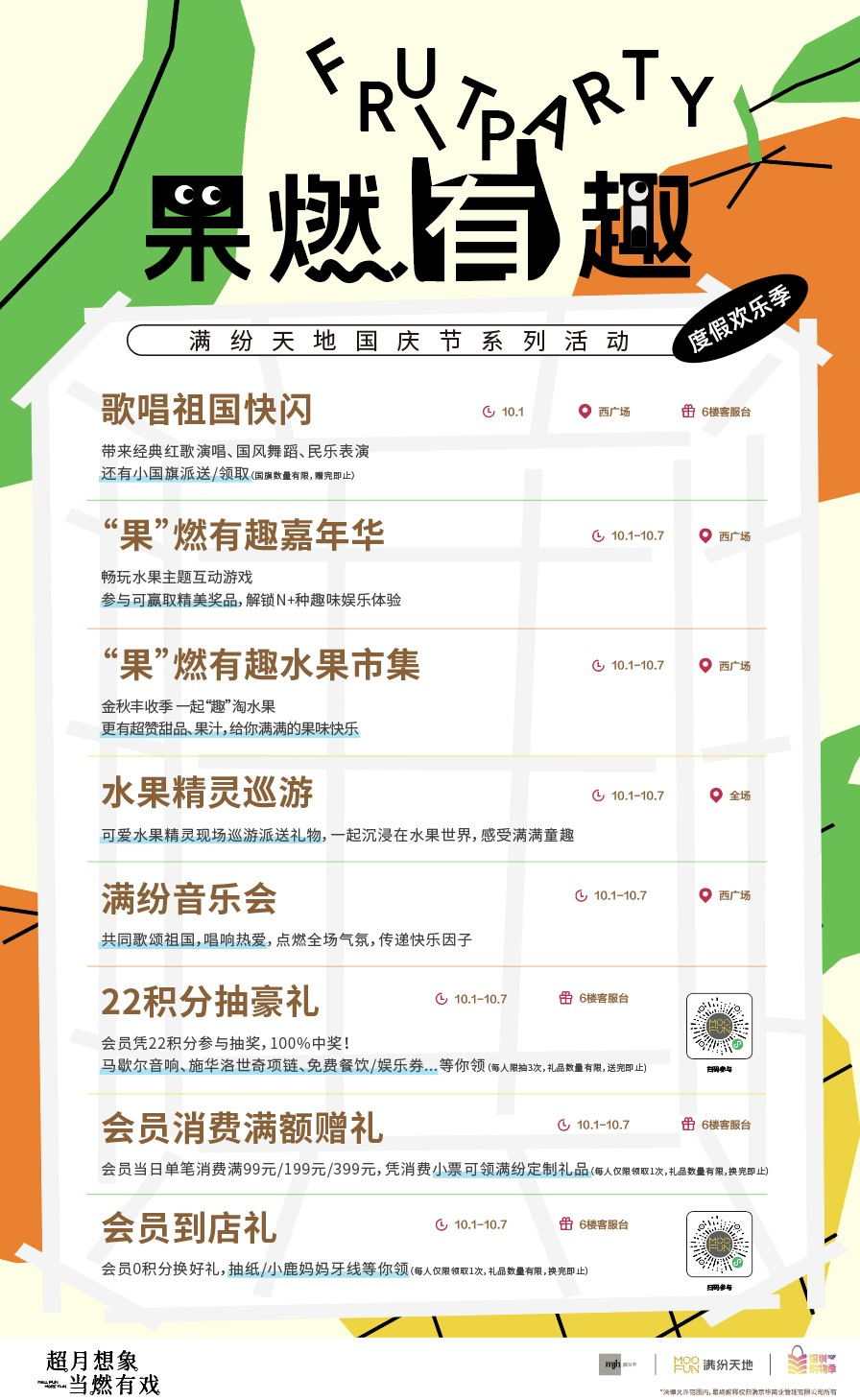 10.1国庆当天,满纷天地将为现场顾客派发小国旗,一同欣赏经典红歌演唱、国风舞蹈表演,共庆祖国华诞;国庆假期期间,“果”燃有趣嘉年华带来多样有趣好玩的水果主题互动游戏,参与游戏可赢取水果好礼;超赞水果市集限时开启,优质水果、甜品和果汁现场售卖,全场更有可爱水果精灵巡游,参与互动还有精美礼物赠送。国庆期间,满纷天地西广场也有常态化的音乐演唱会,邀请本土人气乐队现场开嗓;10.7带来精彩少儿汇演,满满童趣,打造轻松、快乐的假期氛围,乐趣无限。