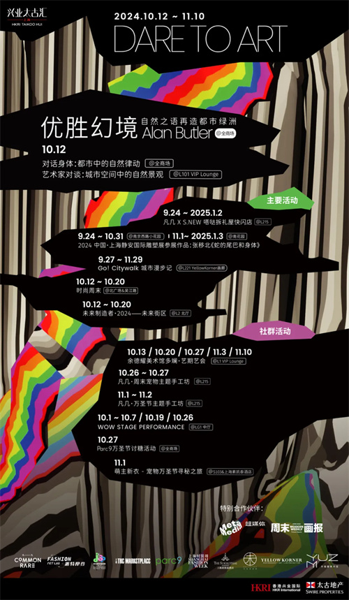 2024年10月12日,兴业太古汇正式启幕2024“Dare To Art”公共艺术季。活动以多元文化为核心,联合艺术家艾伦·巴特勒 (Alan Butler)、时尚周末和未来预想图等来自不同领域的艺术家与品牌,让项目公共空间成为文化的舞台,打造一场融合艺术装置、文化展览和时尚零售场景的城中热事。