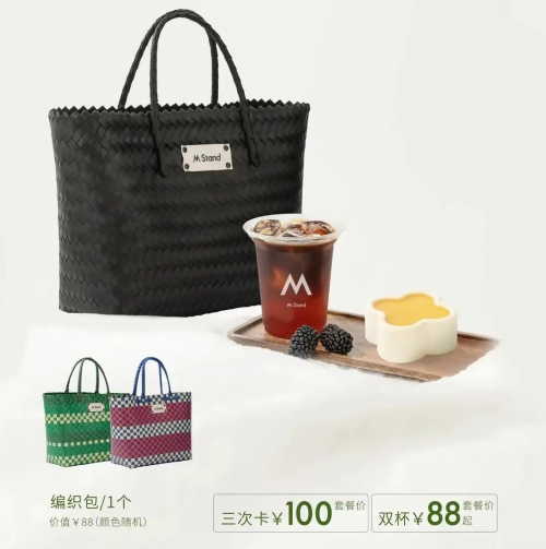相比于杯子,另一个咖啡品牌M Stand更钟情于送包。7月5日,M Stand推出的一款编织包火爆全网。该款编织包与某大牌的包包外形相似,而消费者仅需购买双杯咖啡套餐或者咖啡三次卡即可获赠,其中最热门的黑色发售当天很快就显示已售罄。