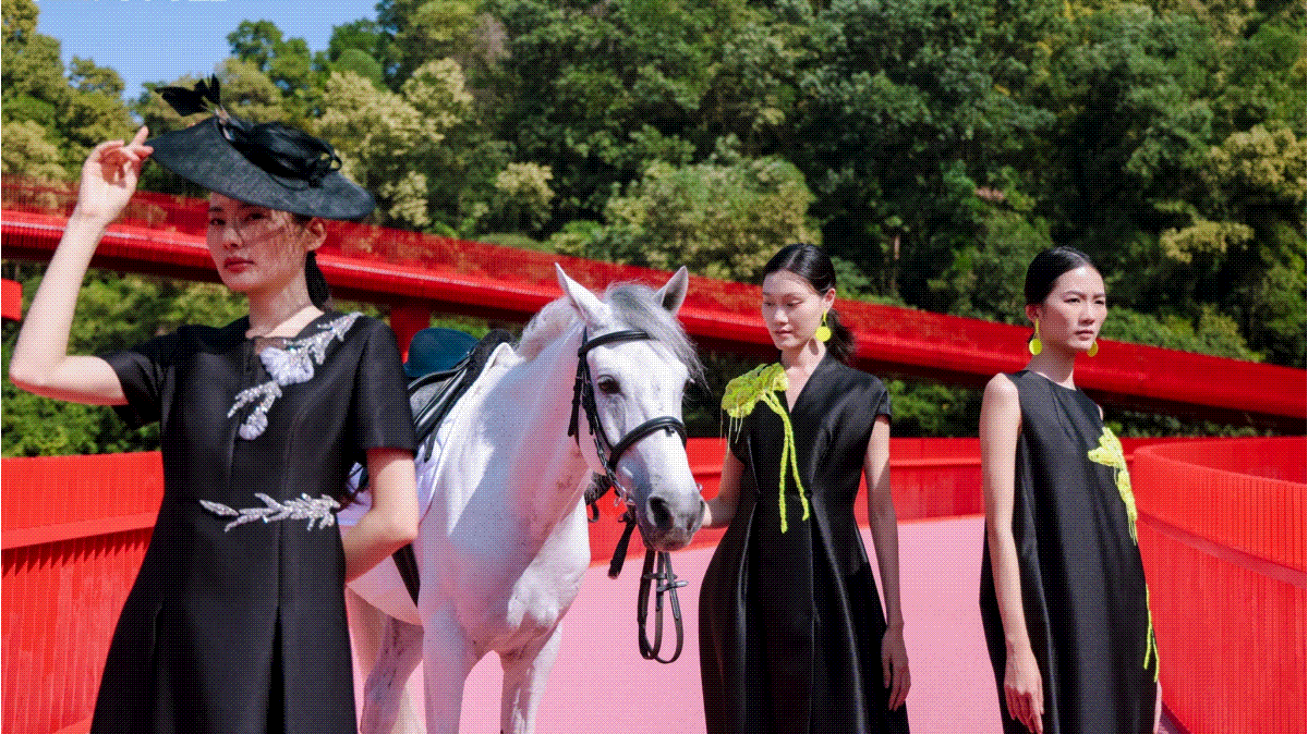 绵延4公里的虹桥,横跨在繁茂的植被间与莹莹的碧波上,犹如一条舞动的红丝带。其独特的自然风光和艺术氛围,为时尚盛宴搭建起绝佳的舞台。天虹携手粉蓝、艺之卉、伊芙丽、艾琳、斐乐、比华利保罗、金利来和杰克琼斯8家知名服饰品牌联袂呈现。模特们以优雅的姿态穿梭于虹桥之上,将服饰的最佳风姿与品牌的独特理念完美呈现。