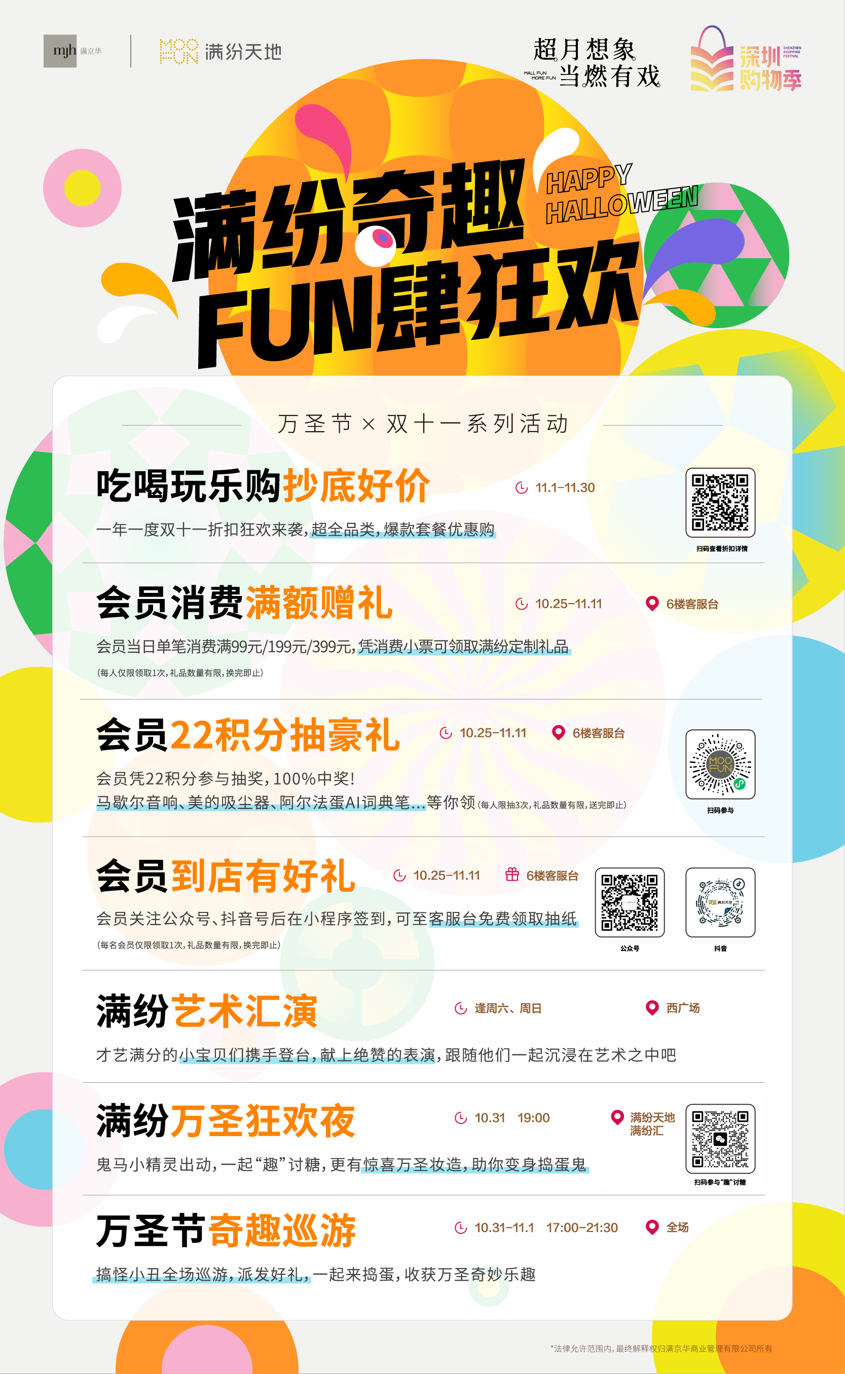 10月31日,万圣夜狂欢,满纷天地将在西广场提供万圣节特别妆造服务,帮助前来游玩的顾客变身“捣蛋鬼”,一起融入到万圣夜的狂欢氛围中,当晚还有惊喜“讨糖计划”,邀请各位鬼马小精灵们一起“趣”讨糖,带来沉浸式游玩体验;10月31日至11月1日,满纷天地全场开启奇趣巡游活动,由搞怪小丑带队,游行于商场各个角落,与其偶遇会收到惊喜礼物,带来超多游玩乐趣。万圣节之外,在11月的每个周末,满纷天地都会有满纷艺术汇演,多才多艺的少儿带来舞蹈、音乐、演讲...等多样艺术表演,为周末时光增添乐趣,精彩不停歇。