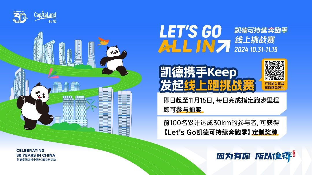 即日起至11月15日,每人每天单次完成指定里程(3km/5km/10km及以上)任务后,即可参与抽奖赢取好礼,包括凯德入华30周年纪念IP限量周边、Keep手环/会员月卡/动感单车等,前100名完成个人累计里程30km的参与者,还可获得定制款实体奖牌。