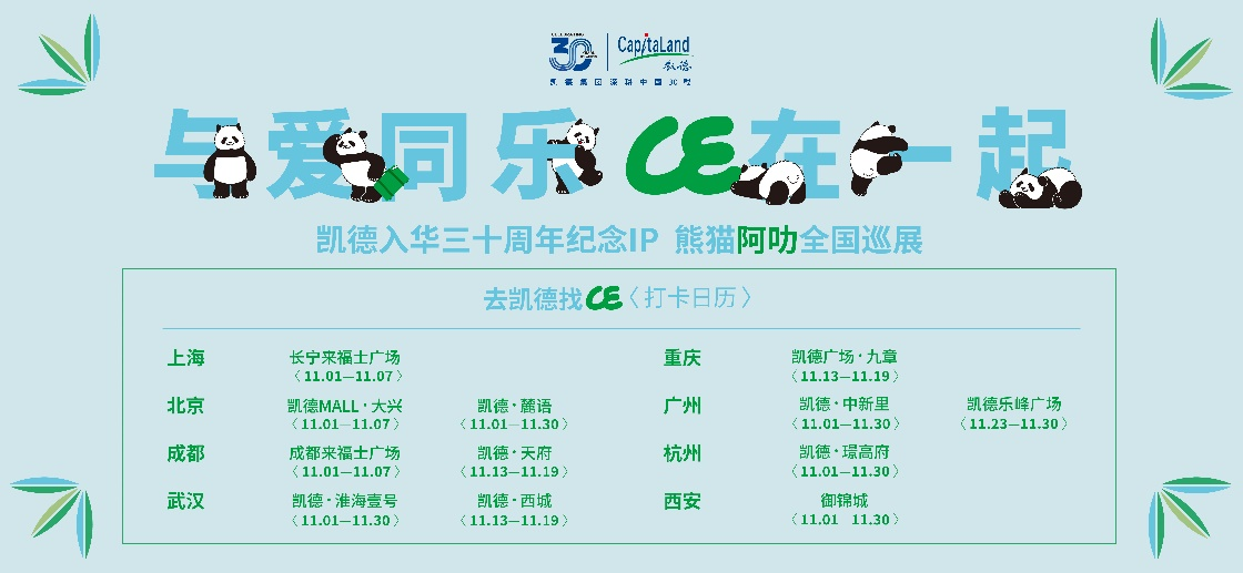 11月,“与爱同乐,LE在一起”熊猫阿叻IP全国巡展将在上海、北京、成都、武汉、重庆、广州、杭州和西安等地的凯德物业中亮相。憨态可掬、活泼可爱的熊猫阿叻IP形象将与当地市民及消费者见面,与大家分享快乐与祝福,现场打卡并在小红书平台分享还可赢取熊猫阿叻IP限量周边(活动规则以现场说明为准)。