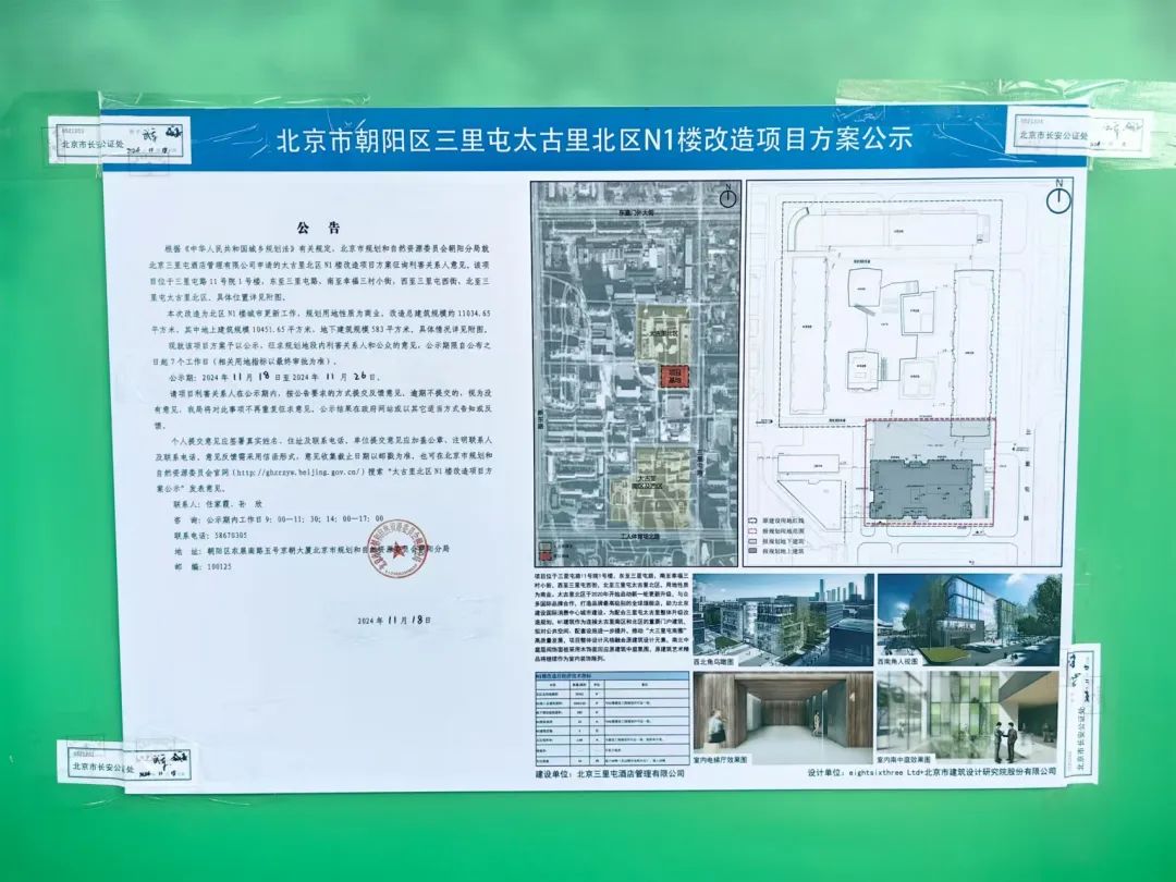 据了解,N1建筑原为太古里瑜舍酒店,位于三里屯路11号院1号楼,东至三里屯路,南至幸福三村小街,西至三里屯西街,北至三里屯太古里北区。