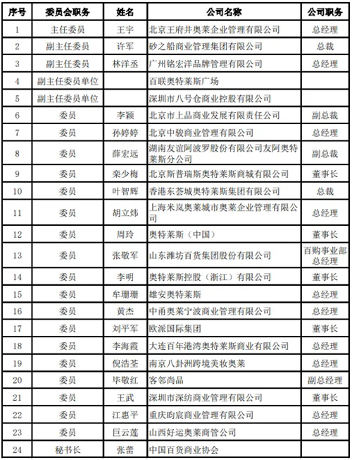 根据协会章程规定和行业工作需要,经中国百货商业协会第九届第一次理事会(2024年11月13上海召开)审议通过,本届中国百货商业协会分支机构“奥特莱斯产业发展工作委员会”组织构架如下: