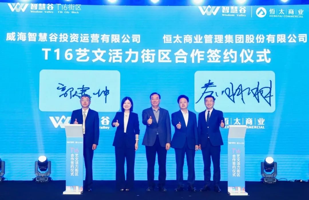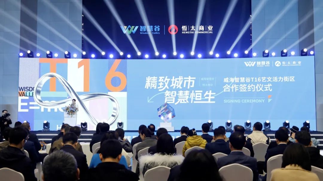 在与会领导、企业负责人及120余家知名品牌商家的见证下,威海智慧谷投资运营有限公司与恒太商业管理集团股份有限公司正式签约。随后,与会嘉宾共同点亮魔方,全面启动威海智慧谷T16艺文活力街区项目。
