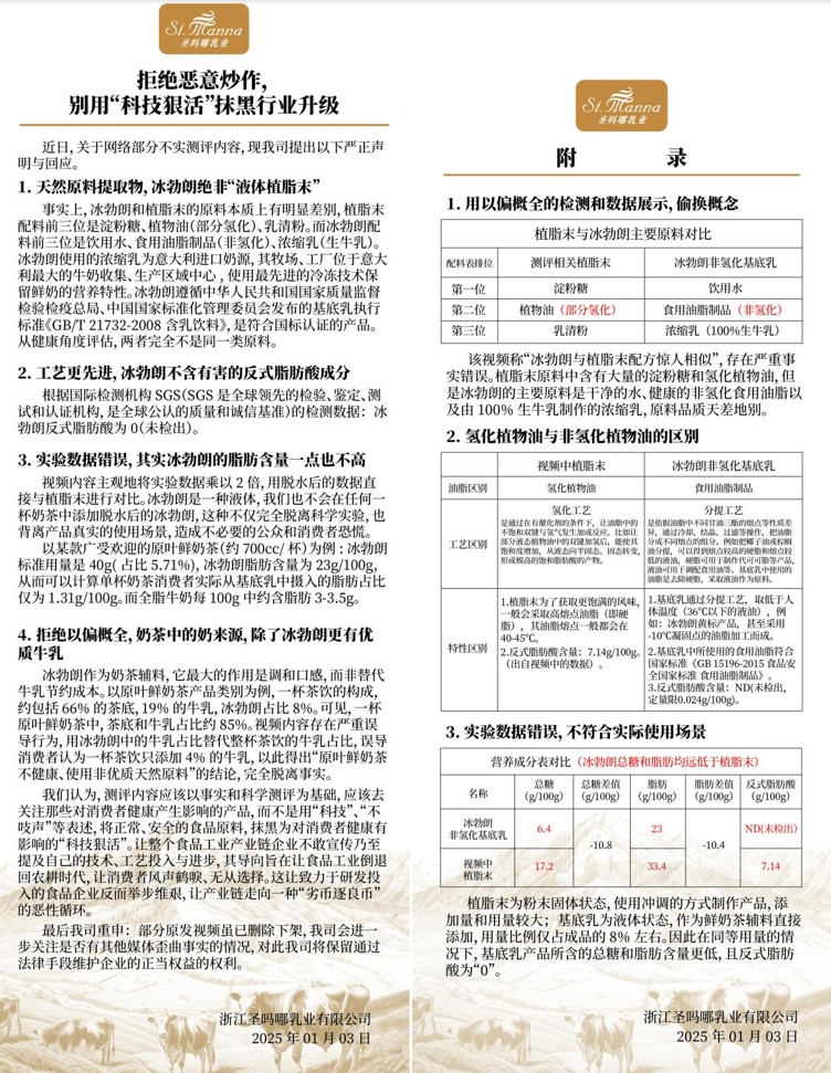 圣吗哪回应,根据国际检测机构SGS的数据,就原料本质与健康影响而言,冰勃朗与植脂末是两种完全不同的食品原料,评测视频以偏概全,采用错误的实验数据,而非实际使用场景来对饮品的工艺定性,存在对消费者的巨大误导。