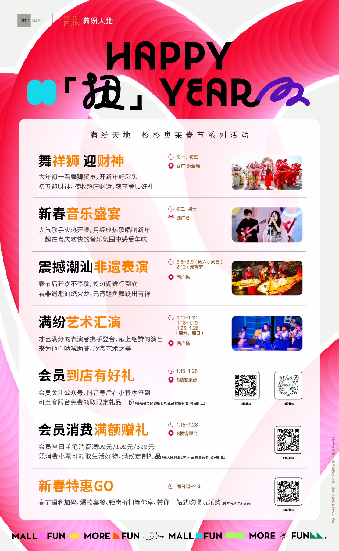 春节前,满纷天地每周末将有精彩少儿文艺汇演、满纷音乐会、满纷创意市集等趣味活动惊喜呈现,看点不停。春节期间,大年初一欣赏雄狮贺岁,开个新年好彩头;初五迎财神,象征发财好运的财神IP形象在满纷天地全场巡游,顾客参与互动即可获得惊喜赠礼,共同接受财神的眷顾,收获新年美好祝福。从初二到初七(1.30-2.4),满纷天地还将带来连续五天的新春音乐会,经典热门新春歌曲轮番上演,一起在喜庆欢快的音乐中感受年味,营造浓厚的新春氛围。春节后,满纷天地的节日狂欢也尚未结束,2.8-2.9周末,更将带来震撼的火潮汕烧火龙表演,看龙腾盛世贺新春,感受传统文化的磅礴魅力;2.12更有潮汕鱼灯舞,共贺元宵,狂欢不停歇,年味不落幕。