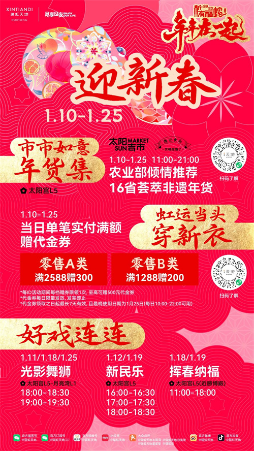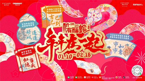 2025年1月10日至2月16日,瑞虹天地“年年在一起”春节主题活动围绕“福禄寿喜财”五福及中国日报国际版头版插图主笔李旻创作的“新有福蛇”元素打造新春主题场景,同时迎合广大消费者年前年后迎新春、贺新岁的消费及阖家欢庆的场景及内容需求,再次举办年货市集、年俗市集,新年穿新衣等主题促销,并带来近百场年俗演出,与上海人民共同辞旧迎新过蛇年,愿每个人都能在乙巳年万事如意,新有福蛇。
