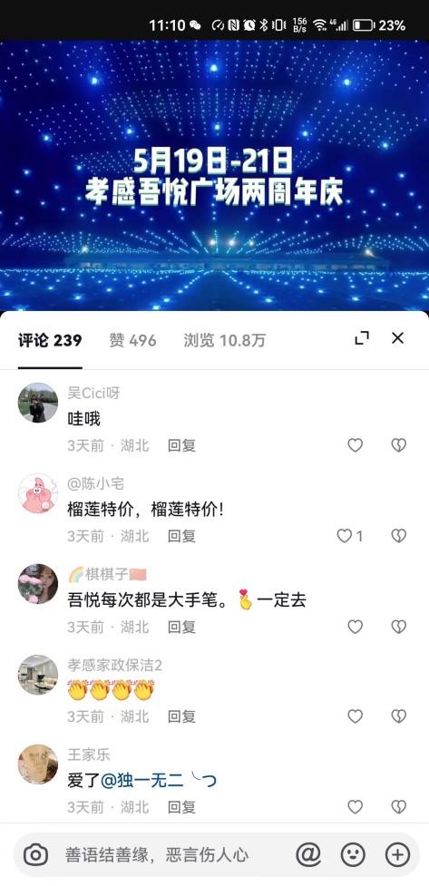 比如说,在孝感吾悦广场的周年庆活动中,通过官方抖音账号下消费者的评论发现,在sp促销中,榴莲这种单价较高的水果促销会比较吸引消费者,而在这个城市,对于无人机表演活动,广大市民充满期待。因此针对这两点,进行了进一步宣传推送,并围绕此活动进行相关消费设置和引导,从而吸引了更多市民参与,增加了客流和销售,此话题的讨论也反复成为热点。