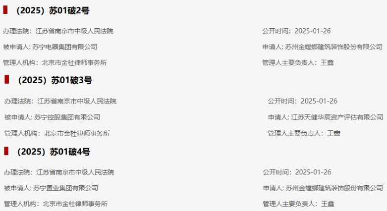 全国企业破产重整案件信息网公布的信息显示,苏宁控股集团有限公司(下称“苏宁控股”)、苏宁电器集团有限公司(下称“苏宁电器”)和苏宁置业集团有限公司(下称“苏宁置业”)分别被江苏天健华辰资产评估有限公司和苏州金螳螂建筑装饰股份有限公司申请重整。相关案件已被南京市中级人民法院受理。