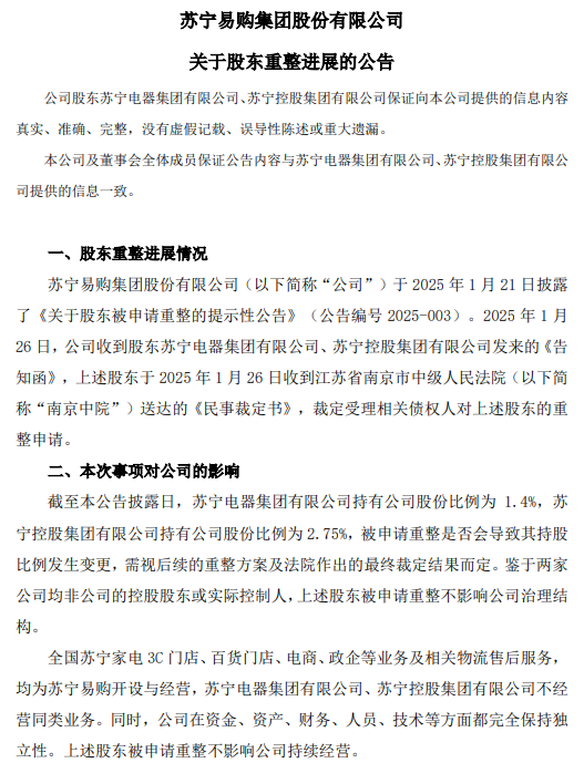 苏宁易购表示,截至1月27日,苏宁电器集团持有苏宁易购1.4%股份,苏宁控股集团持有苏宁易购2.75%股份。被申请重整是否会导致其持股比例发生变更,需视后续重整方案及法院最终裁定结果而定。两家公司均非公司的控股股东或实际控制人,被申请重整不影响公司治理结构及持续经营。