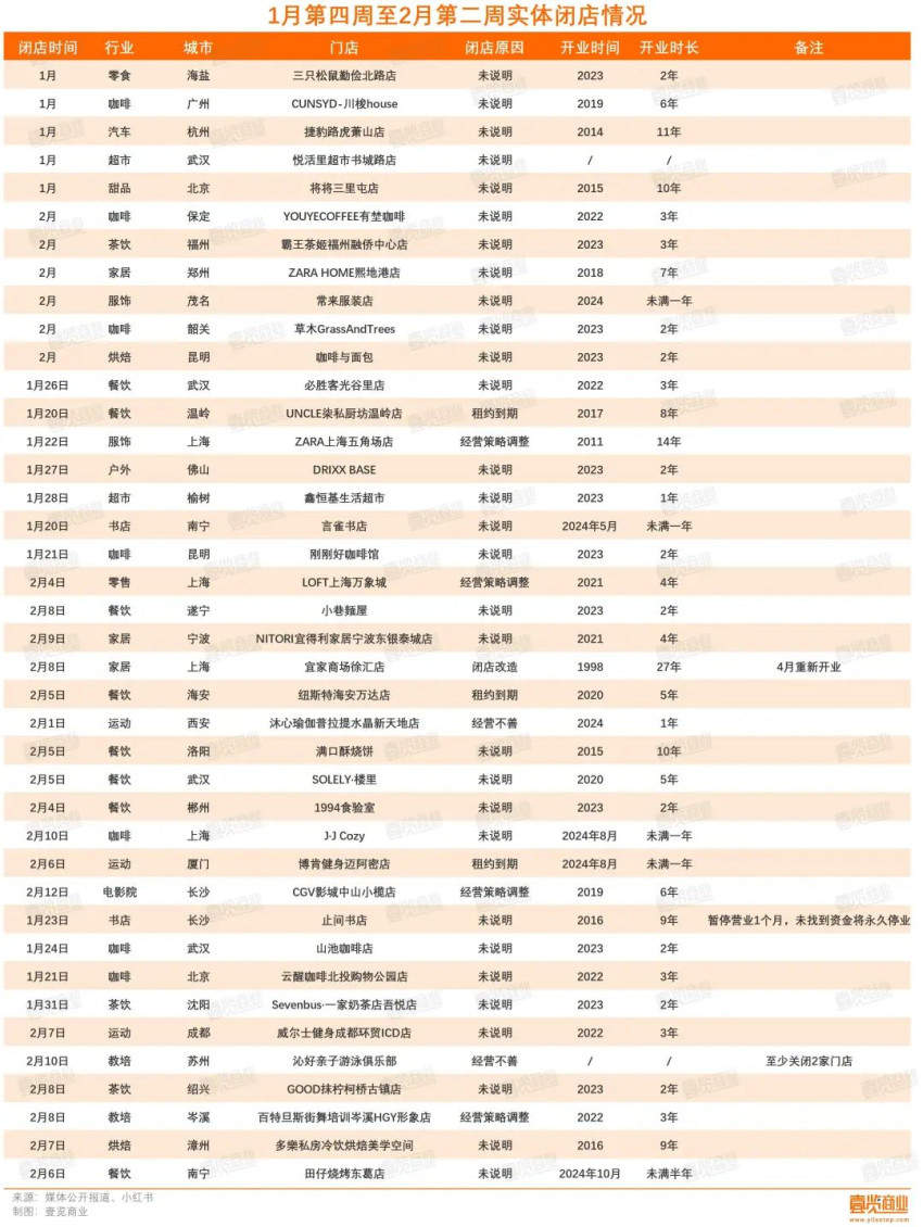 从行业看,有2家超市关闭,分别为武汉的悦活里超市、榆树的鑫恒基生活超市;21家餐饮门店关闭,其中10家为茶咖门店;3家家居门店关闭,分别是ZARA HOME、宜得利家居、宜家家居,其中,宜家家居为暂停营业,预计4月将重新开业。此外,这段时间内,还关闭了2家书店,分别为南宁的言雀书店和长沙的止间书店。
